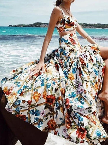 Euro Flower Smocked Waist Flounce Hem Maxi Dress