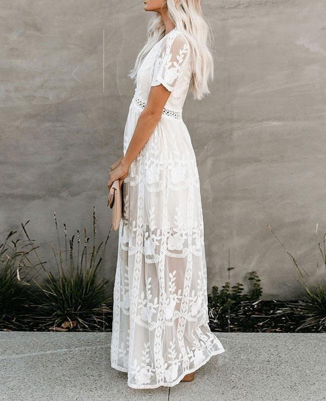 - This long white lace maxi dress with charming V neck make you more attractive. High waisted design will let you looks more appear and leaner