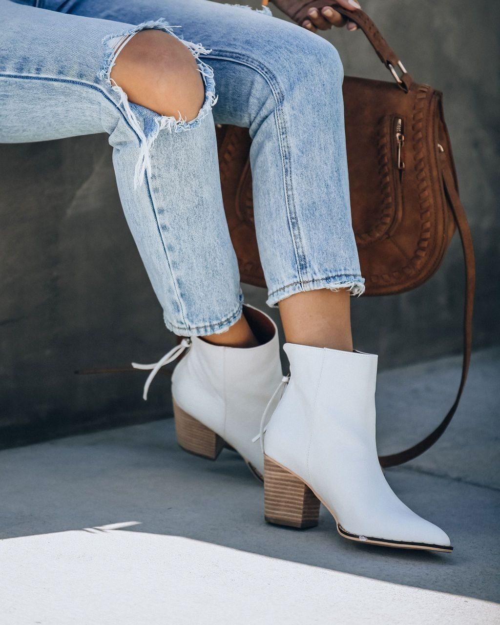 Our Ambrose Faux Leather Heeled Bootie is a crisp bootie ready to rule the day with you! Constructed in white faux leather with a chic ankle length, this bootie fits true to size with brass embellished semi pointed toe. A walkable three inch heel and tassel heeled zipper finish the look. Styled with the Kason High Rise Distressed Denim and the Highland Bag.