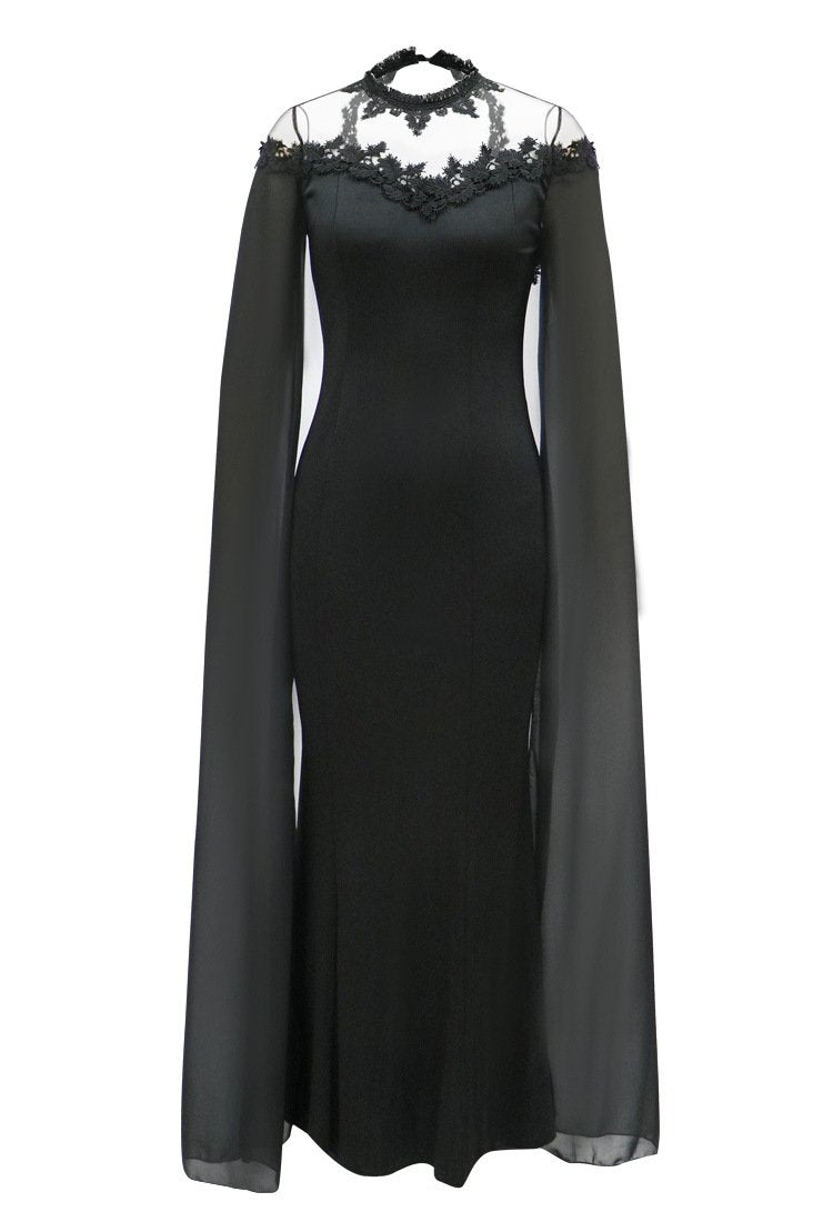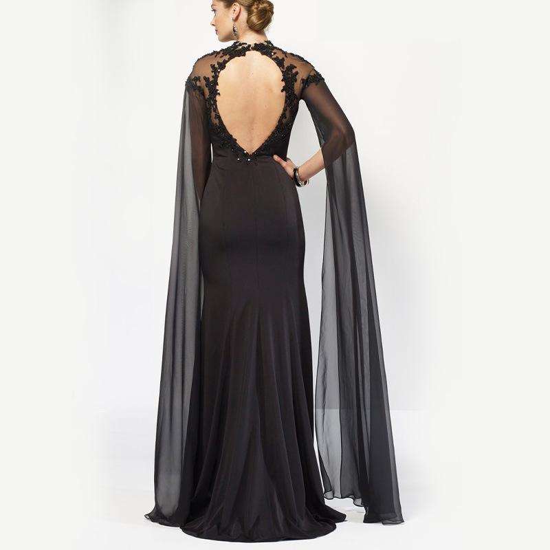 Formal Wear, Stretch Crepe-Chiffon, Lace, Beadings, Sheer long sleeves, Keyhole cutout back