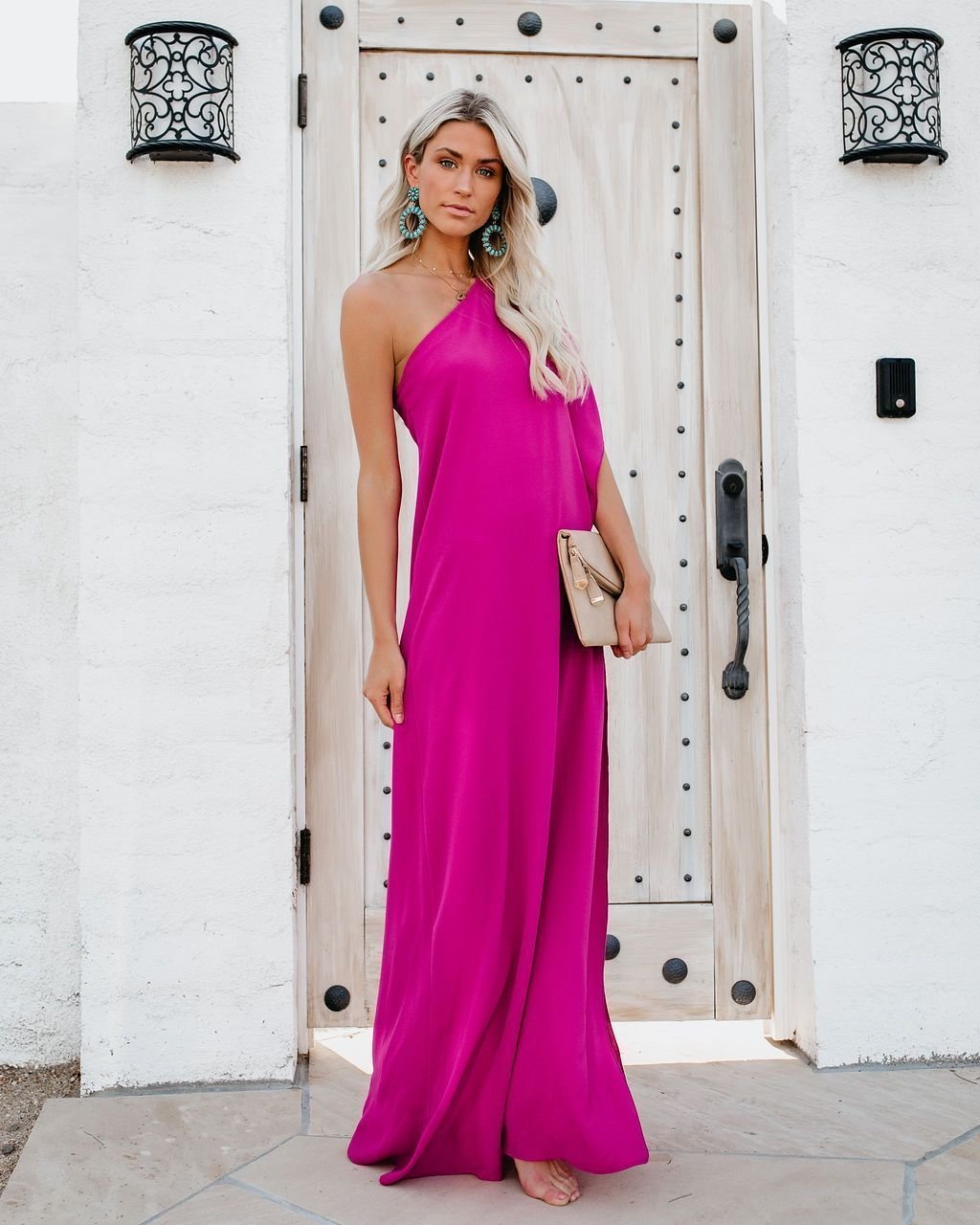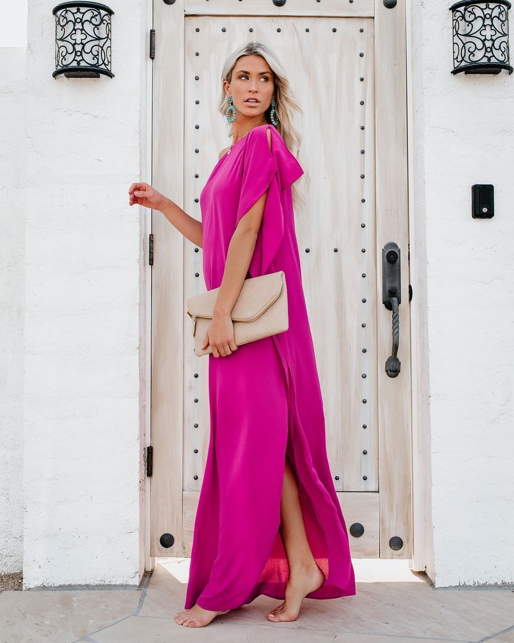 Our Blown Away One Shoulder Statement Maxi Dress features a draping, billowy fabrication creating a relaxed fit. Detailed with draped side flaps and a side slit for a little excitement. Finished with a crepey fabrication perfect for the spring season. Style with statement earrings and sandals to complete the look. Styled with our Stella Crossbody Envelope Zip Clutch, 5 Disc Choker, Creed Necklace, and Indio Valley Statement Earrings.