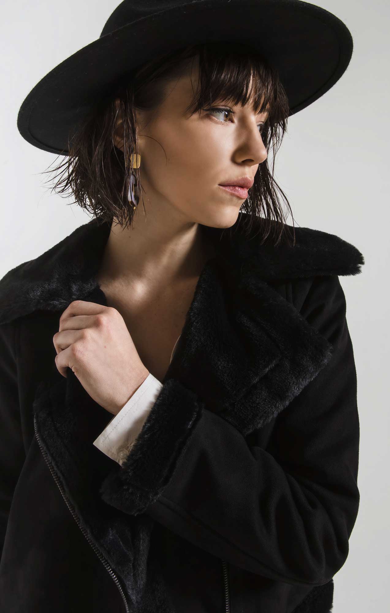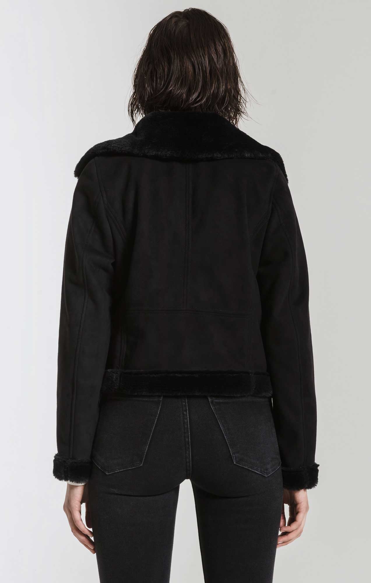 Featuring a faux suede application, the Eva Jacket is made with faux fur details on the lapels, sleeve cuffs and hemline. This moto jacket also implements welt pockets at the sides.
