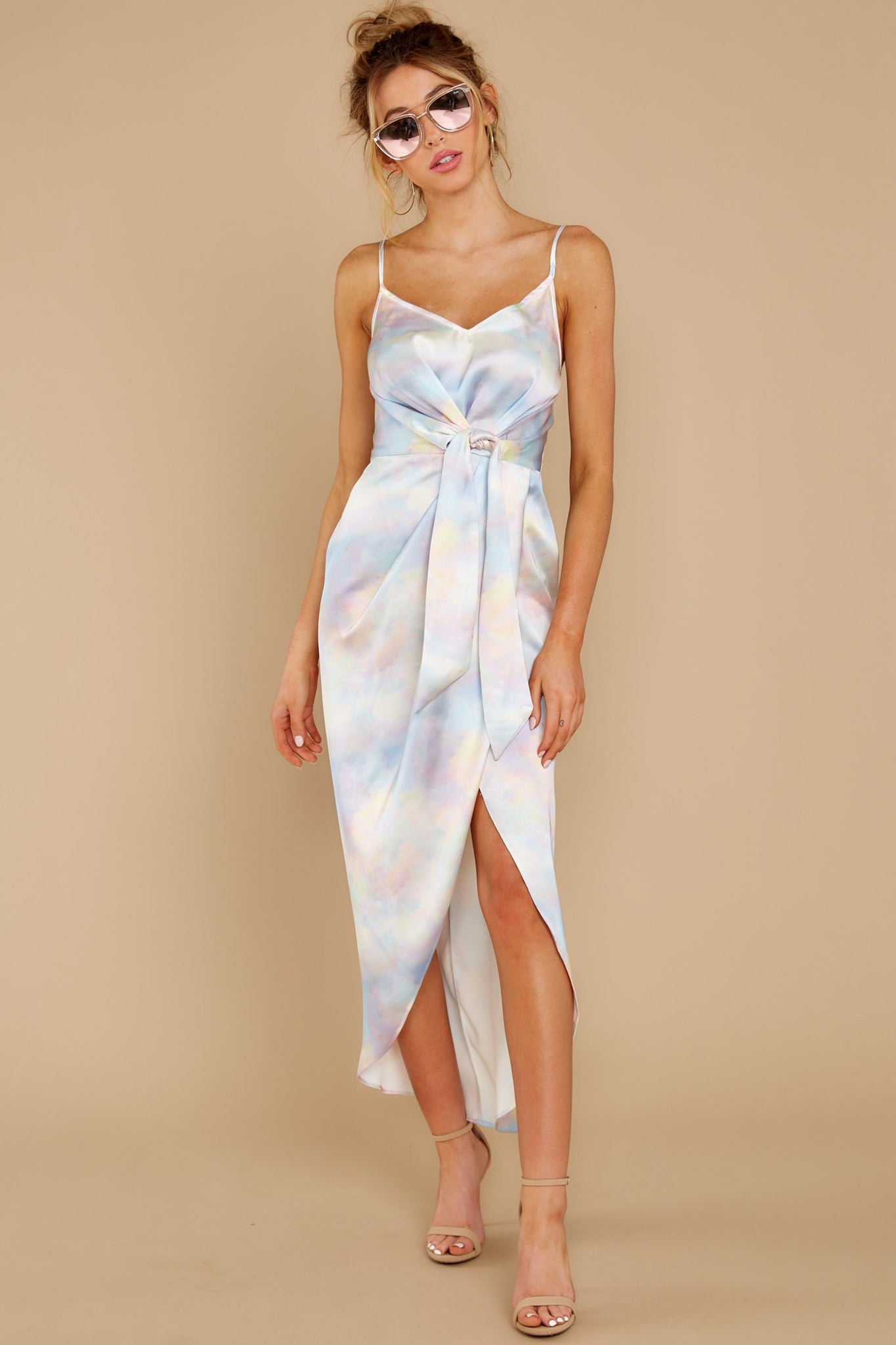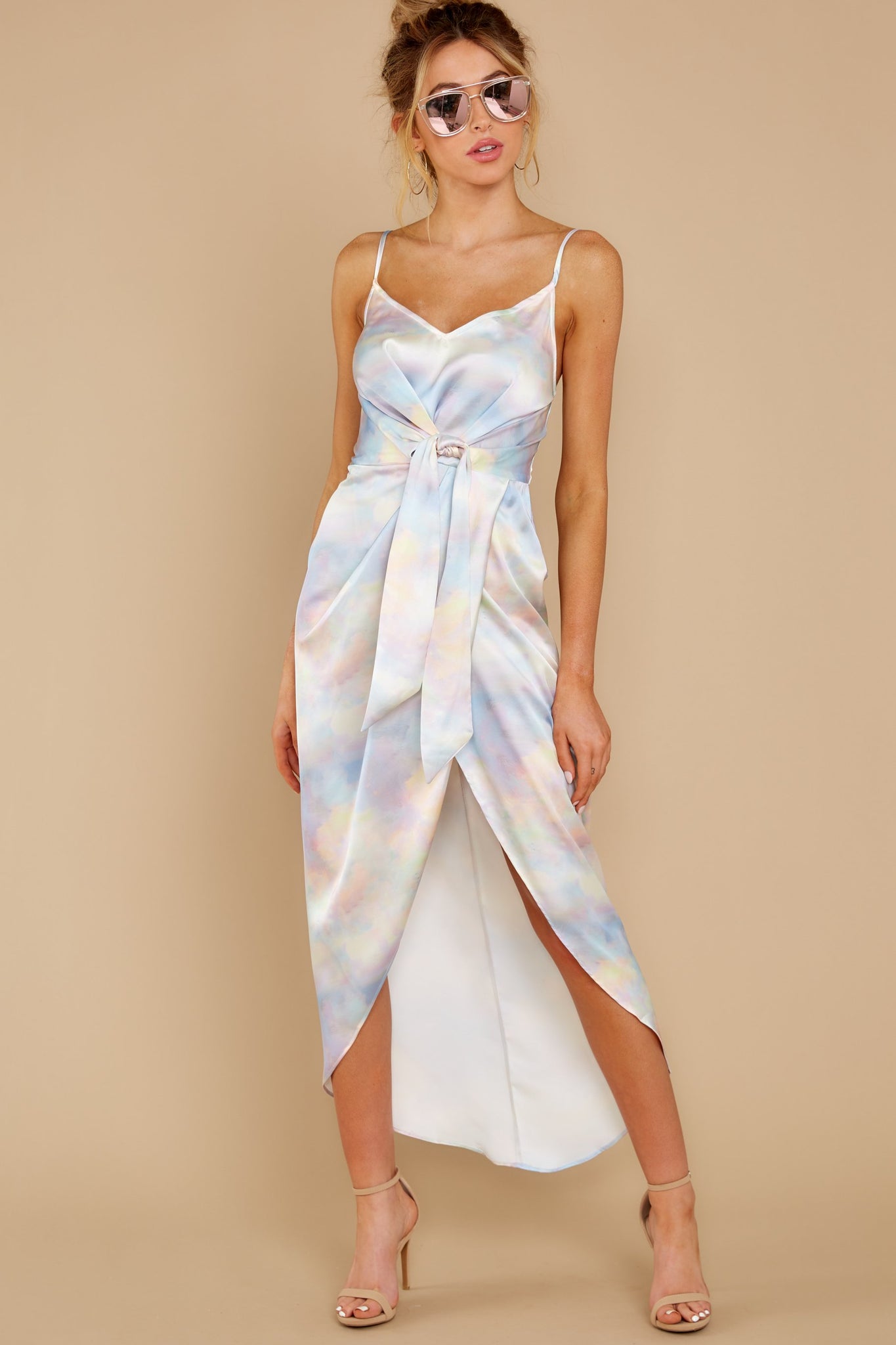 Can you Feel The Groove of this epic tie dye maxi dress? Guuurl...talk about smooth as silk, chic as a sunset, and gorgeous as you. Yeah. This high-low maxi was made for vacay, getaways and dashing date nights. So. Did you order yours yet? Tie-dye maxi dress features a relaxed v-neckline, thin adjustable straps, a hidden back zipper, a seamed front bow tie detail, an imitation wrap front slit detail, and a gorgeous satin finish. Model is wearing a small. • 100% Polyester • Hand Wash Cold • Unlined • Imported