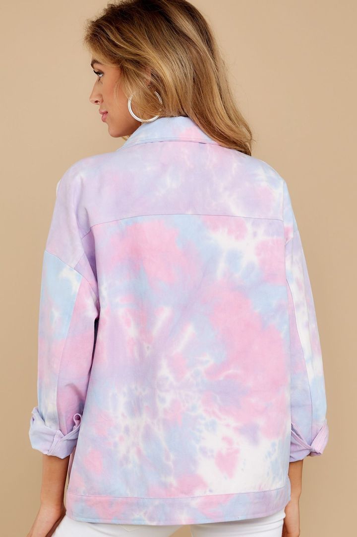 Trendsetting fashion. Stellar looks. Award winning style. Yup. Got It Covered for ya, fashionista. I'm the one and only tie dye jacket a chic lady like you could ever need. Just sayin'. Tie-dye denim jacket features a functional button up front, two functional chest pockets, long sleeves completed by button closure cuffs, two side pockets and hidden interior wall pockets. Model is wearing a small. • 100% Cotton • Hand Wash Cold • Unlined • Imported