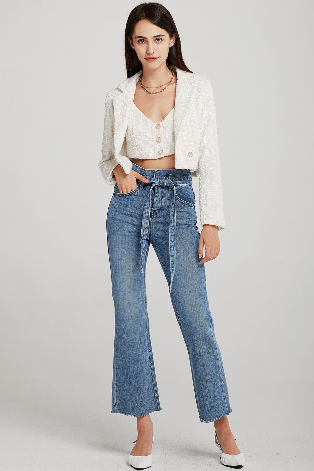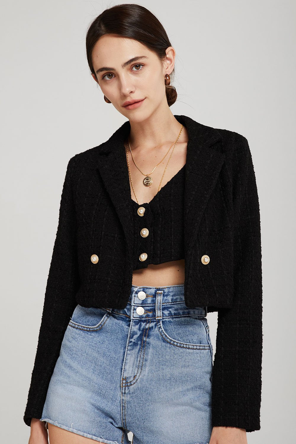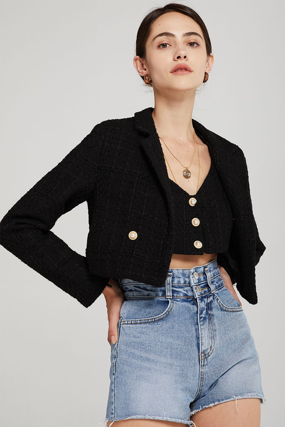 - A matching co ord set ; A boucle material jacket and boucle material crop top set