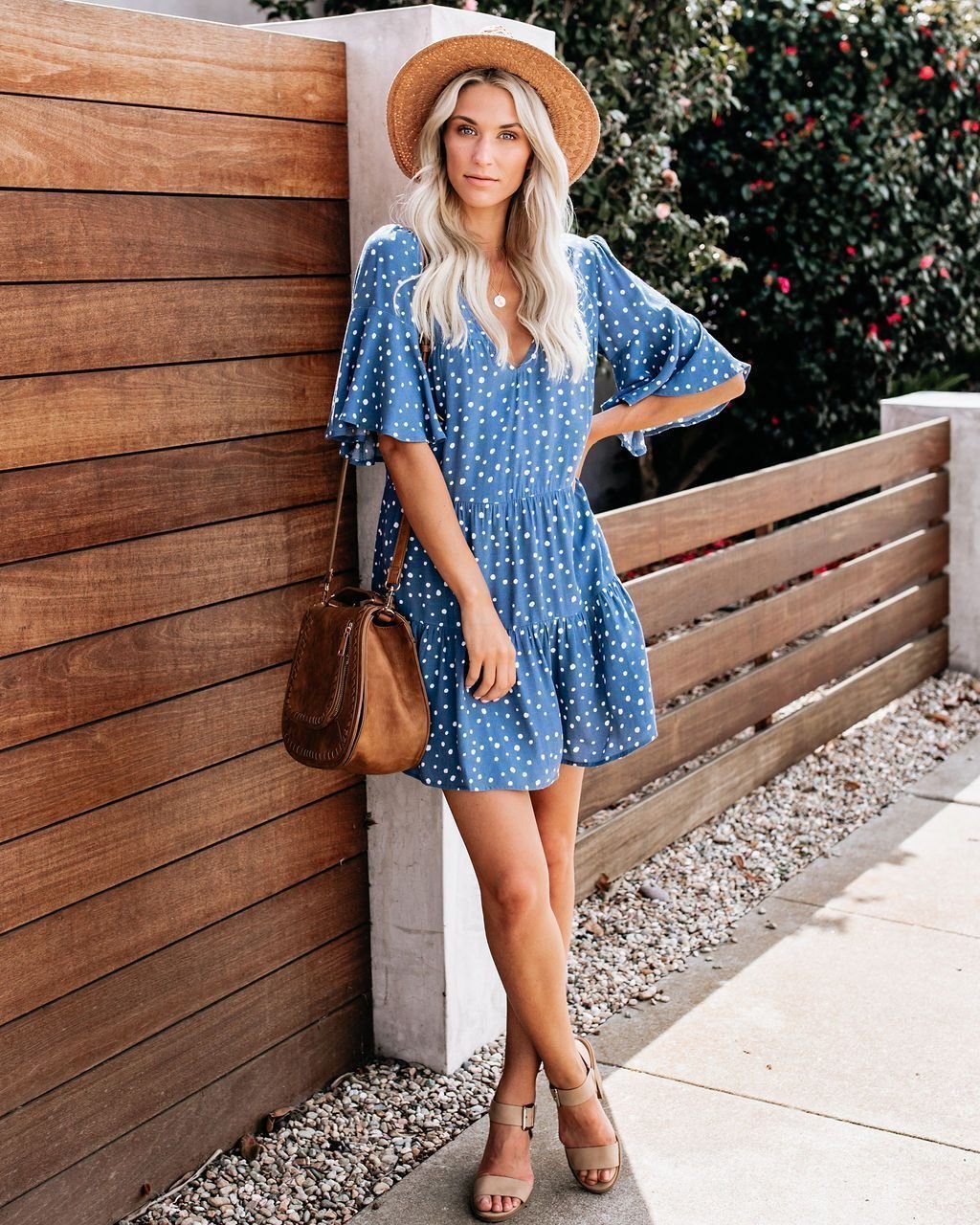 The Hailey Polka Dot Babydoll Dress is sweet as can be! Fit with a baby doll silhouette and half bell sleeves. Featuring a denim blue body with contrast white polka dot print all throughout. Designed with a gathered, tiered skirt to complete the playful spring look! Finished with a concealed back zipper. A trendy little number to style for the warm weather seasons with flatforms. Styled with our 5 Disc Choker, Zodiac Necklace, Velasco Hat, Highland Bag, and Cooper Sandal.
