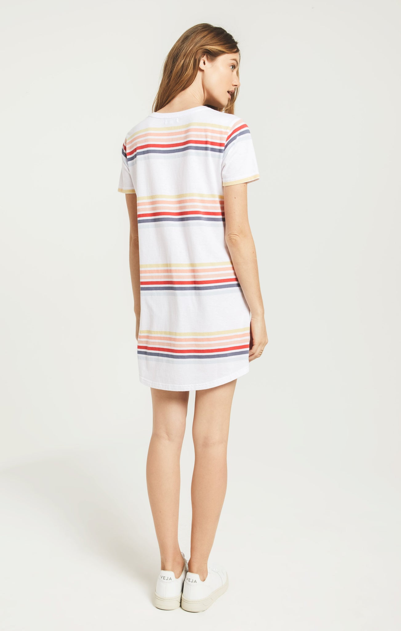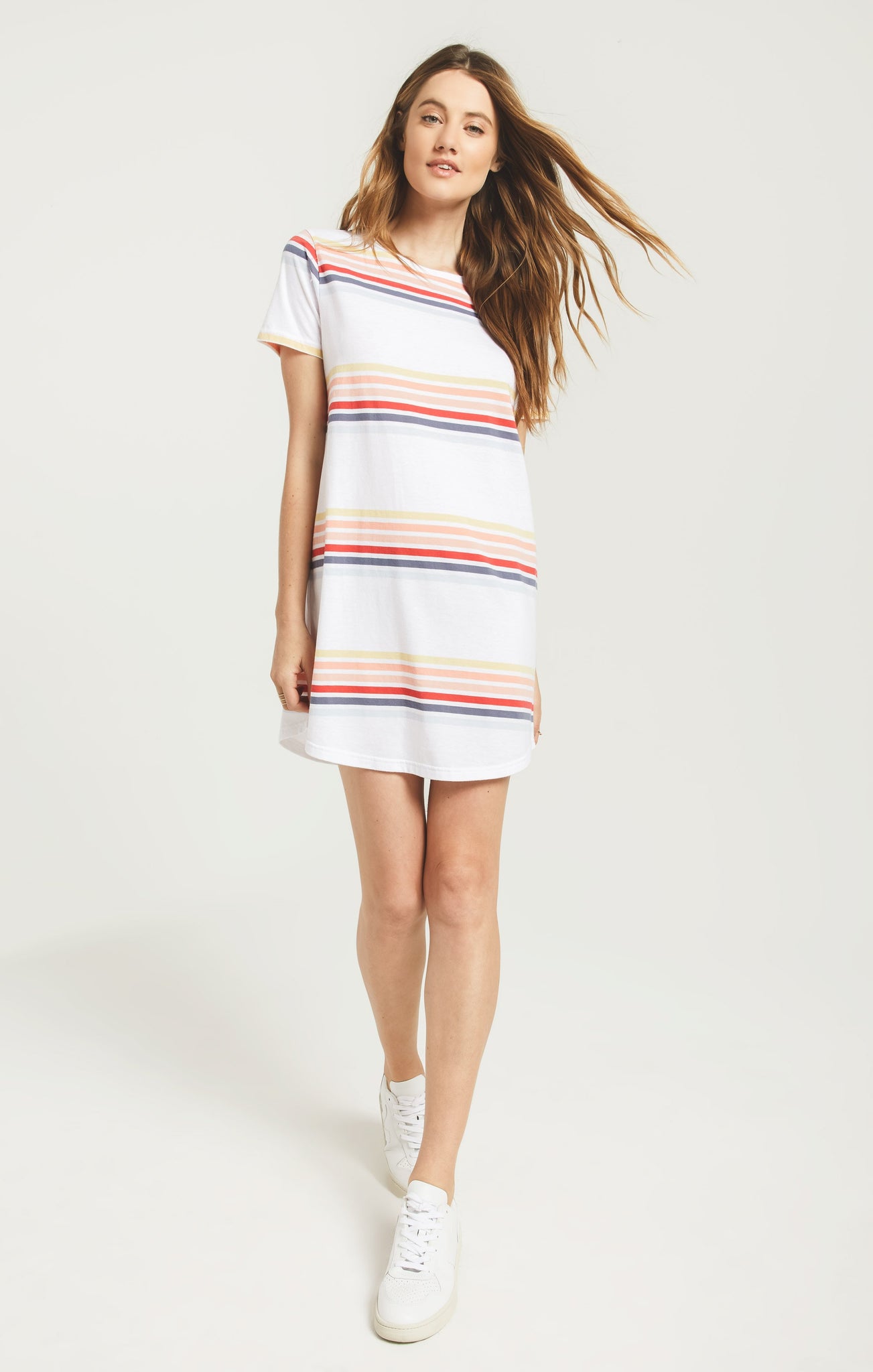 Follow the rainbow to your new favorite dress! The Lanai Stripe Dress features a crewneck, tee-style design with a bright multi-color retro stripe pattern. The soft cotton jersey knit fabric has a flattering rounded hem which offers coverage plus casual, comfortable style.