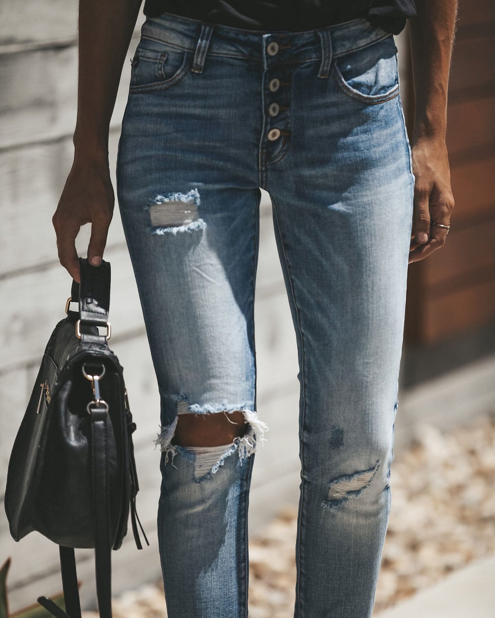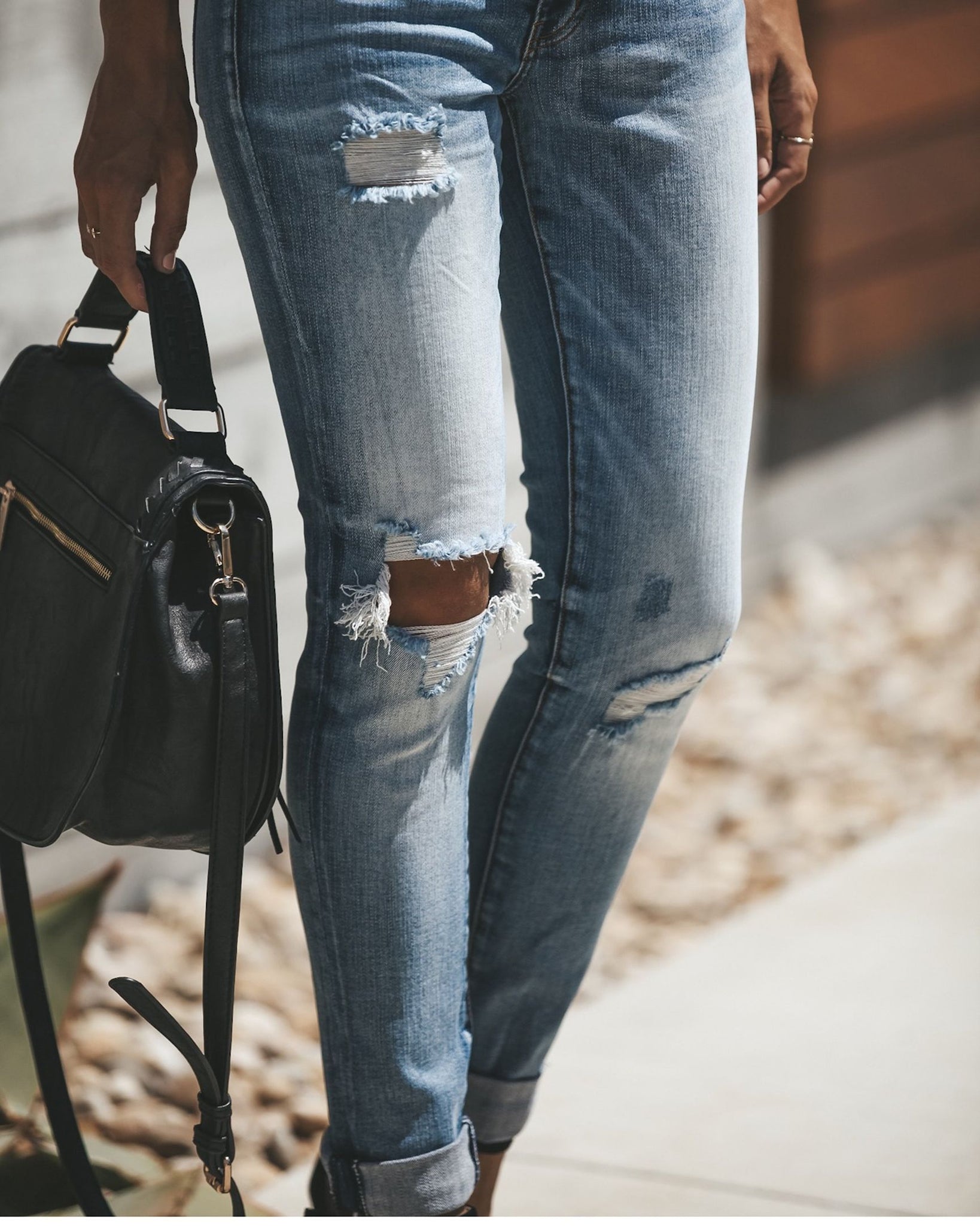 Our Liberation Distressed Girlfriend Skinny denim jeans are super trendy in this light wash and button fly front! The distressing at the knee make these the perfect go-to summer denim! These fit like a glove and will look great with your tanks and sandals this summer! From our best selling denim brand ever! A perfect fit! Styled with the Physique Racerback Tank and the Highland Bag.