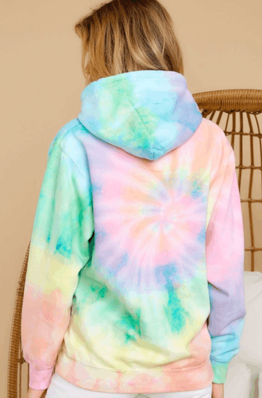 She's got those new vibrations giving off New Sensations of style. Every fashionista needs a tie dye hoodie to make her chill-lax-in' days totally groovy. Tie dye hooded sweatshirt features a drawcord adjustable hood, long sleeves completed by ribbed cuffs, and a functional and stylish kangaroo pocket. Model is wearing a small. • 80% Cotton 20% Polyester • Hand Wash Cold • Unlined • Imported