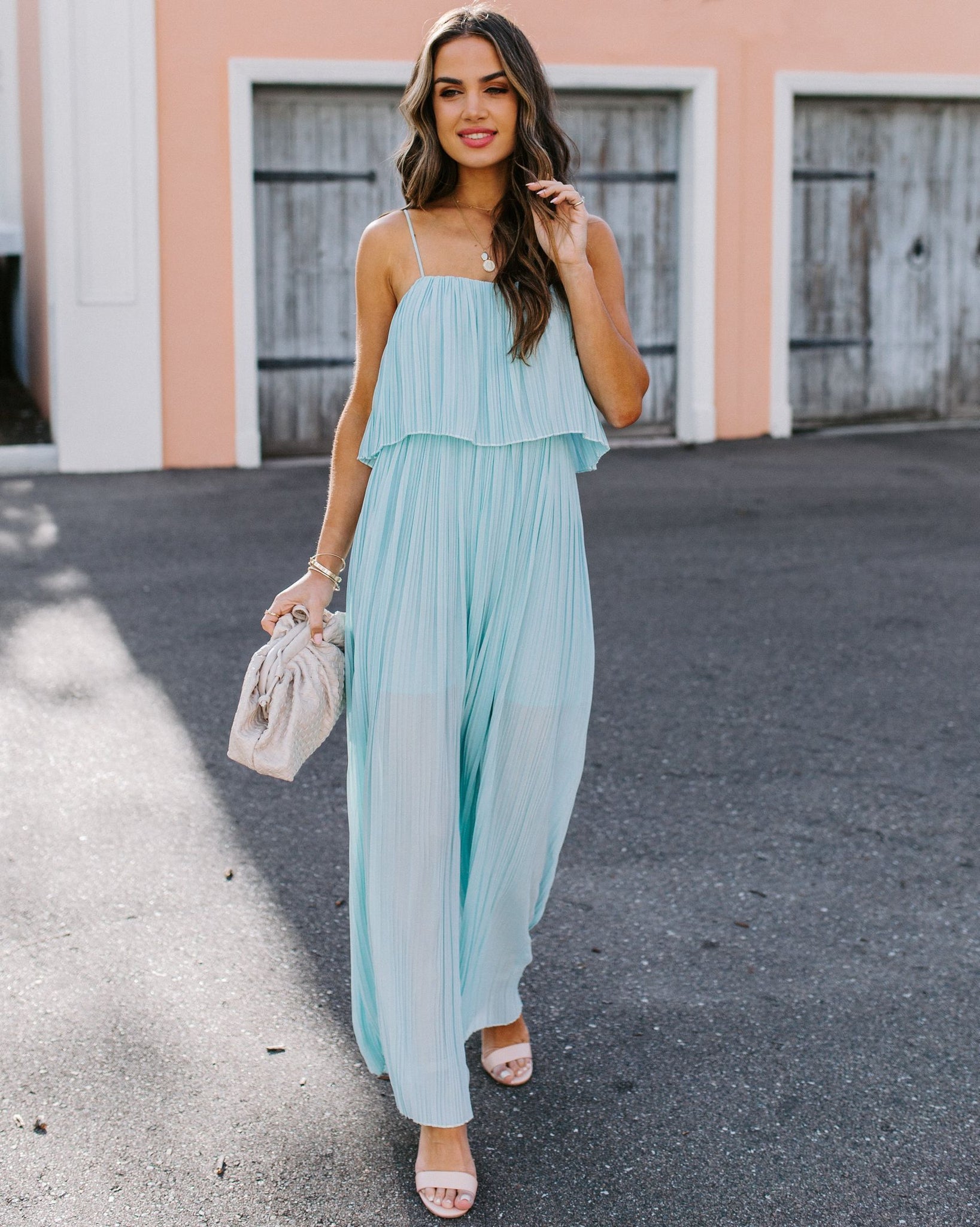 Our Nikita Plisse Jumpsuit exudes elegance! Featuring a tightly plisse fabric in light sage that creates a voluminous silhouette. Designed with a flowy top shelf that hangs daintily from thin cami straps. A high stretch empire waistline flows into wide leg pants to finish the look! Simply add a statement necklace and fab clutch for a special occasion. Styled with the 5 Disc Choker, Palm Coin Necklace, Larkin Heel and the Rome Woven Crossbody Pouch Bag.