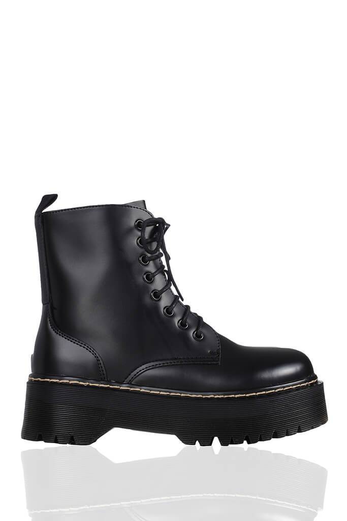 Make like Queen Gee and say hello to your new Spring staples! Black faux leather military style boots with lace up fastening, chunky platform sole and contrast stitch design.