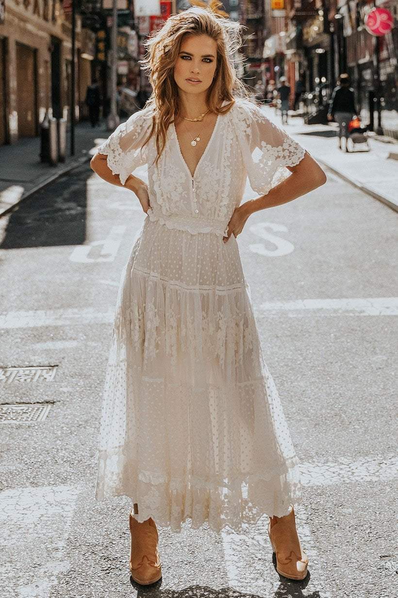 Our luminous Dawn Lace Gown with its four contrasting lace tiers from the waist and shell buttons at the bust, is an exquisite piece, filled with other-worldly romance. Style it simply with a tan slide for a sunlit afternoon cocktail or swap to an ankle boot to make the most of the dreamy silhouette. Fully lined with a V Neckline, full elasticated waist and ladder trim inserts, this enigmatic piece continues our love affair with lace, in signature Spell style, using hand selected pieces, perfectly arranged in hushed convert to offer a classic piece with twists and turns of hypnotic detail.