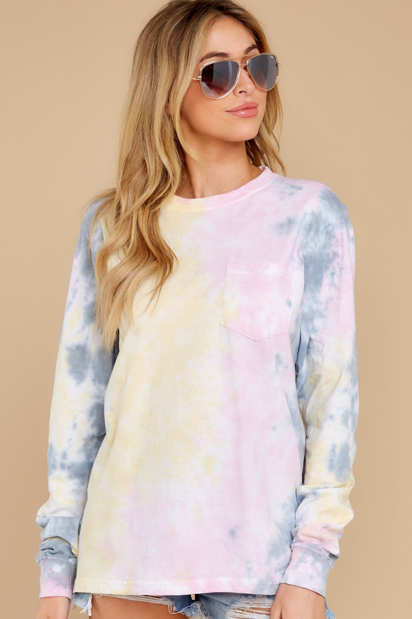 She's loving Summer In Sav, can't you tell? She gets to wear this comfy-soft tie dye top and be exactly where she wants to be. Um, yeah. Every fashionista needs one of these trendsetting tops to whisk her away to her favorite daydream...right? Tie dye top features a round neckline, a front left-side chest pocket, and long sleeves completed by ribbed cuffs. Model is wearing a small. • 100% Combed Cotton • Hand Wash Cold • Unlined • Imported