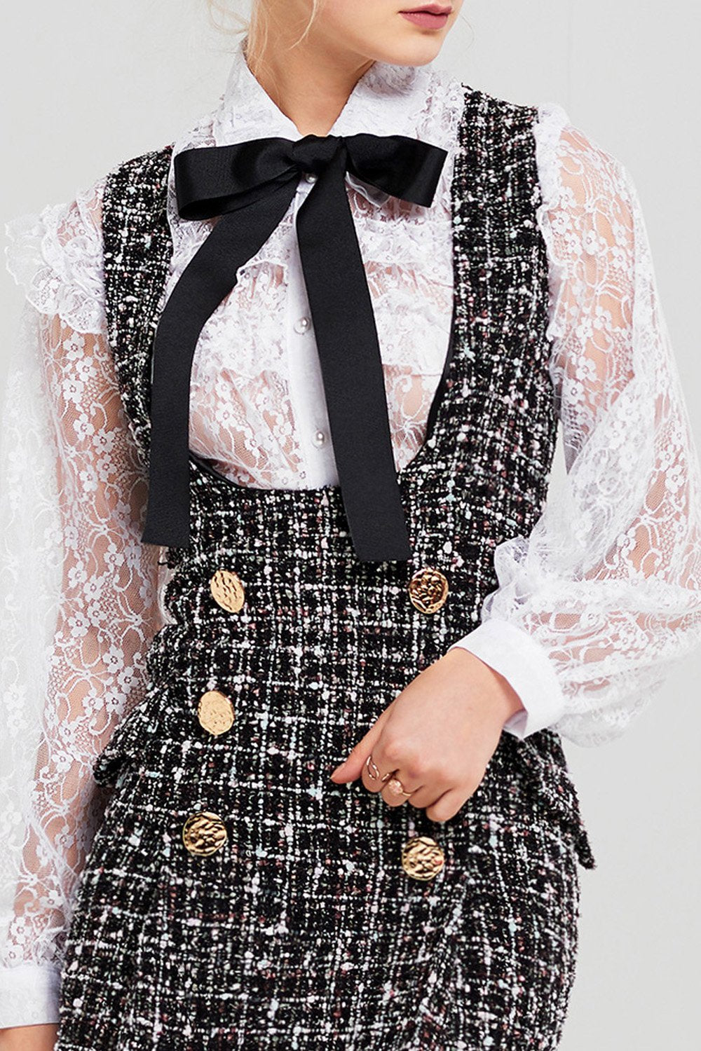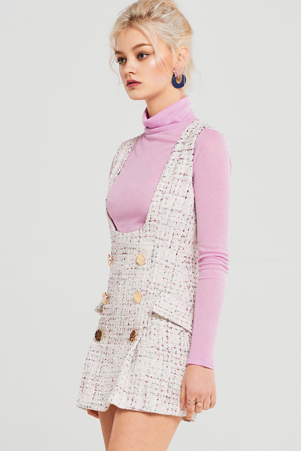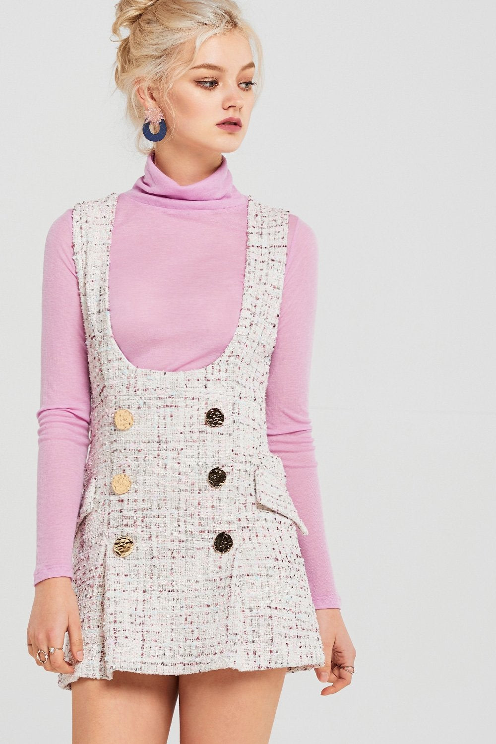 This girly tweed overalls style dress can be worn over any casual top.
