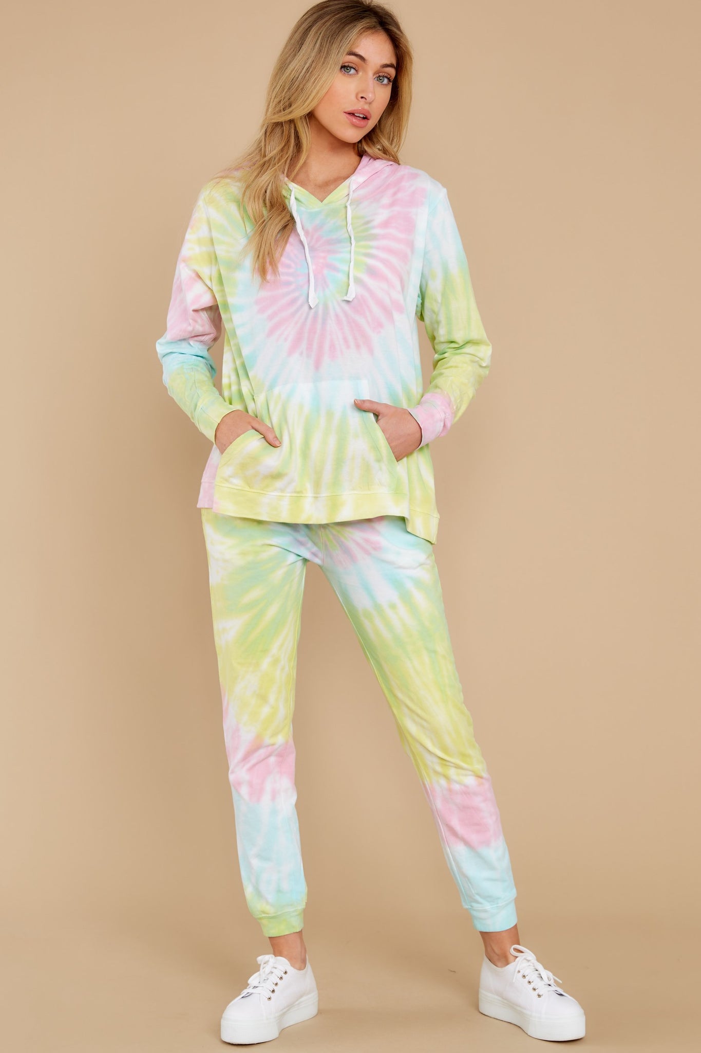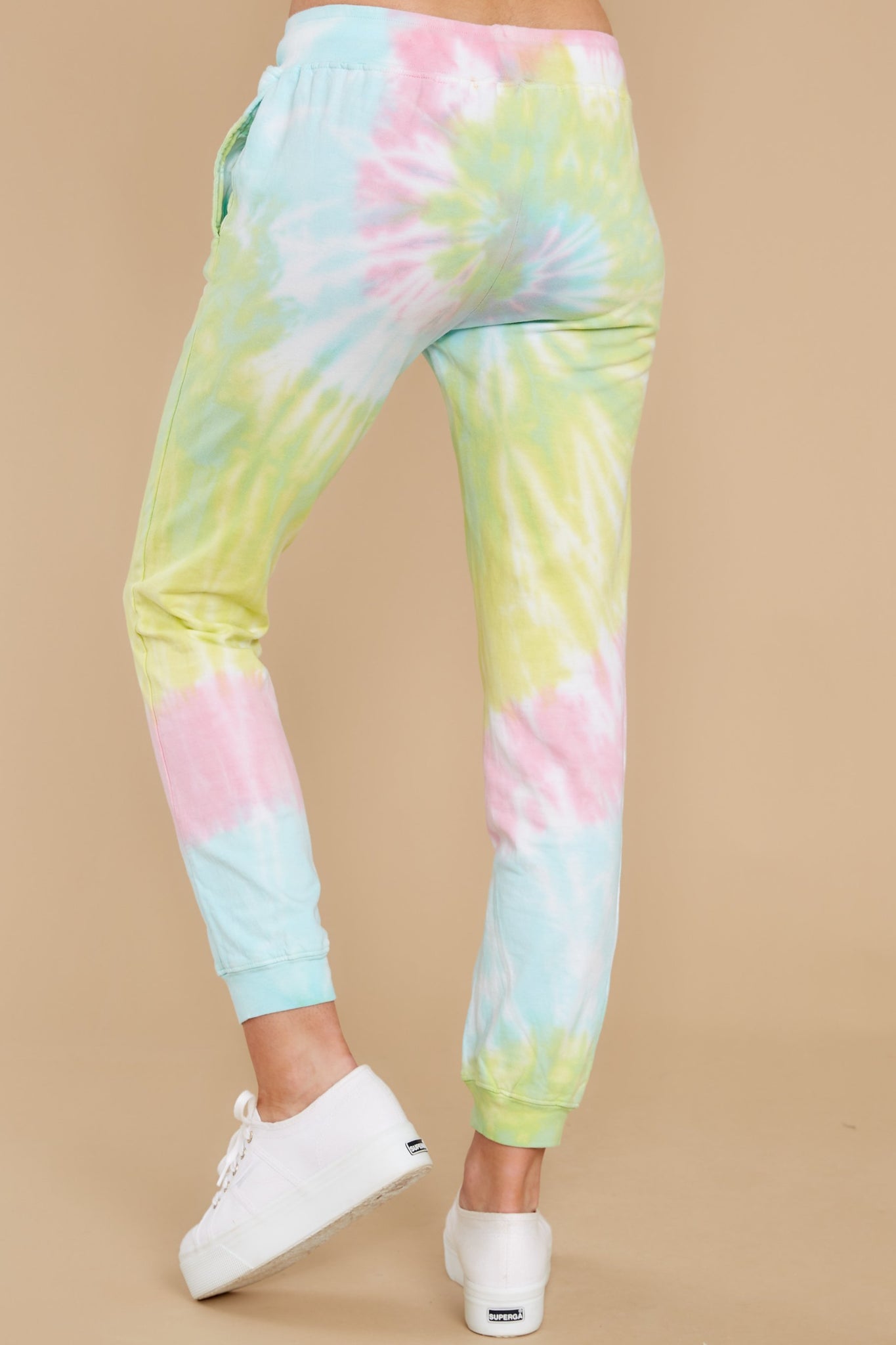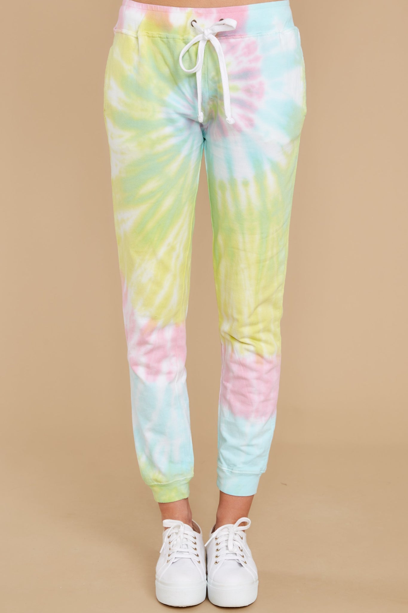 Taking off for a few days to relax and recharge was Totally Worth It. Seriously. Oh, and getting to wear these fun (and über comfy) tie dye joggers, well that was the cherry on top of the whole weekend. Right? Tie-dye joggers feature an elastic waistband complete with a draw-cord adjuster, functional side pockets, and a track pant elastic bottom cuff. Model is wearing a small. • 100% Cotton • Machine Wash Cold • Unlined • Imported
