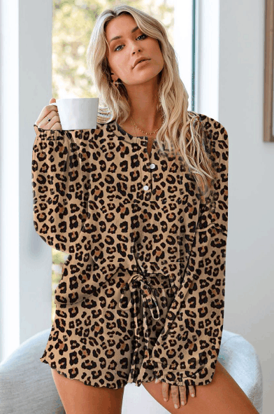Womens Long Sleeve of 2 Piece Short Pajamas Set Nightwear Sleepwear Loungewear-Leopard
