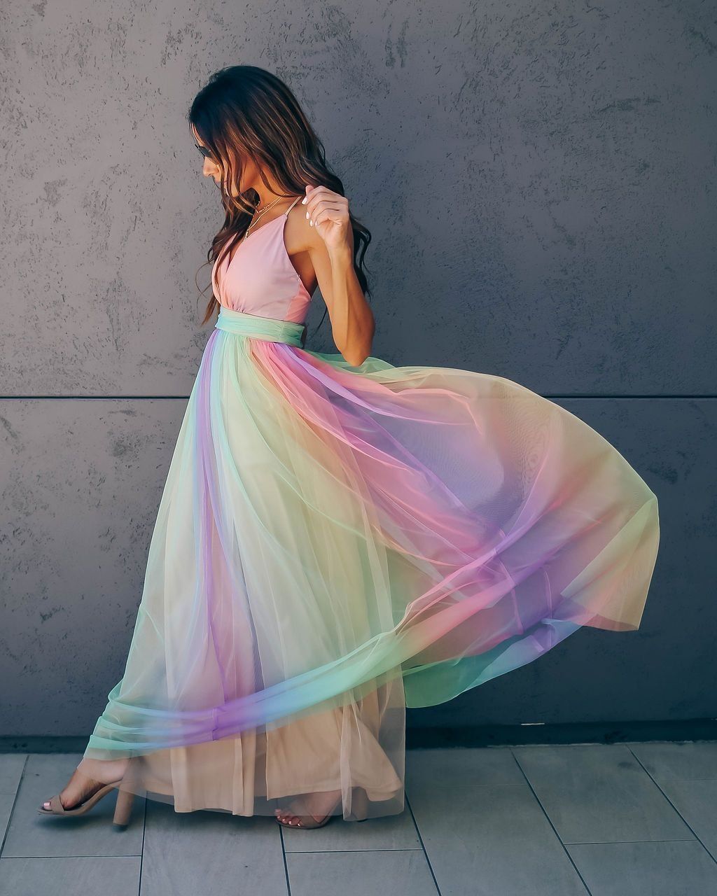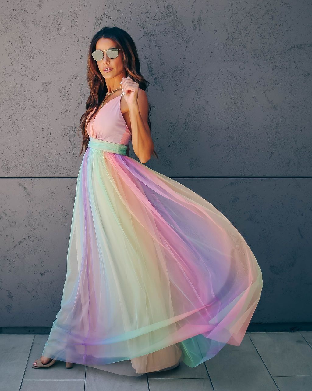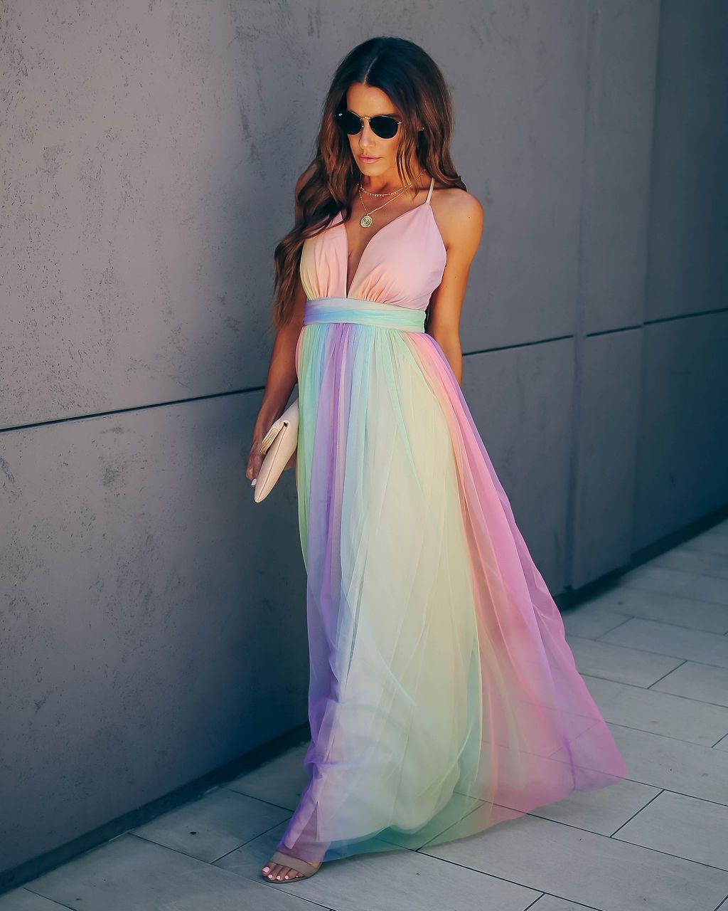 Our stunning Wonderland Rainbow Striped Maxi Dress is a dream! Featuring a pleated tulle overlay in stripes of bright pink, orange, lime green, purple, yellow and blue. A plunging v-neckline complements the fit and flare silhouette. Fit with adjustable straps that criss cross the back. Finished with a full lining and concealed back zipper closure. Styled with the Chloe Mini Necklace, Mosaic Coin Necklace, Make A Scene Heels and Stella Crossbody Envelope Zip Clutch.
