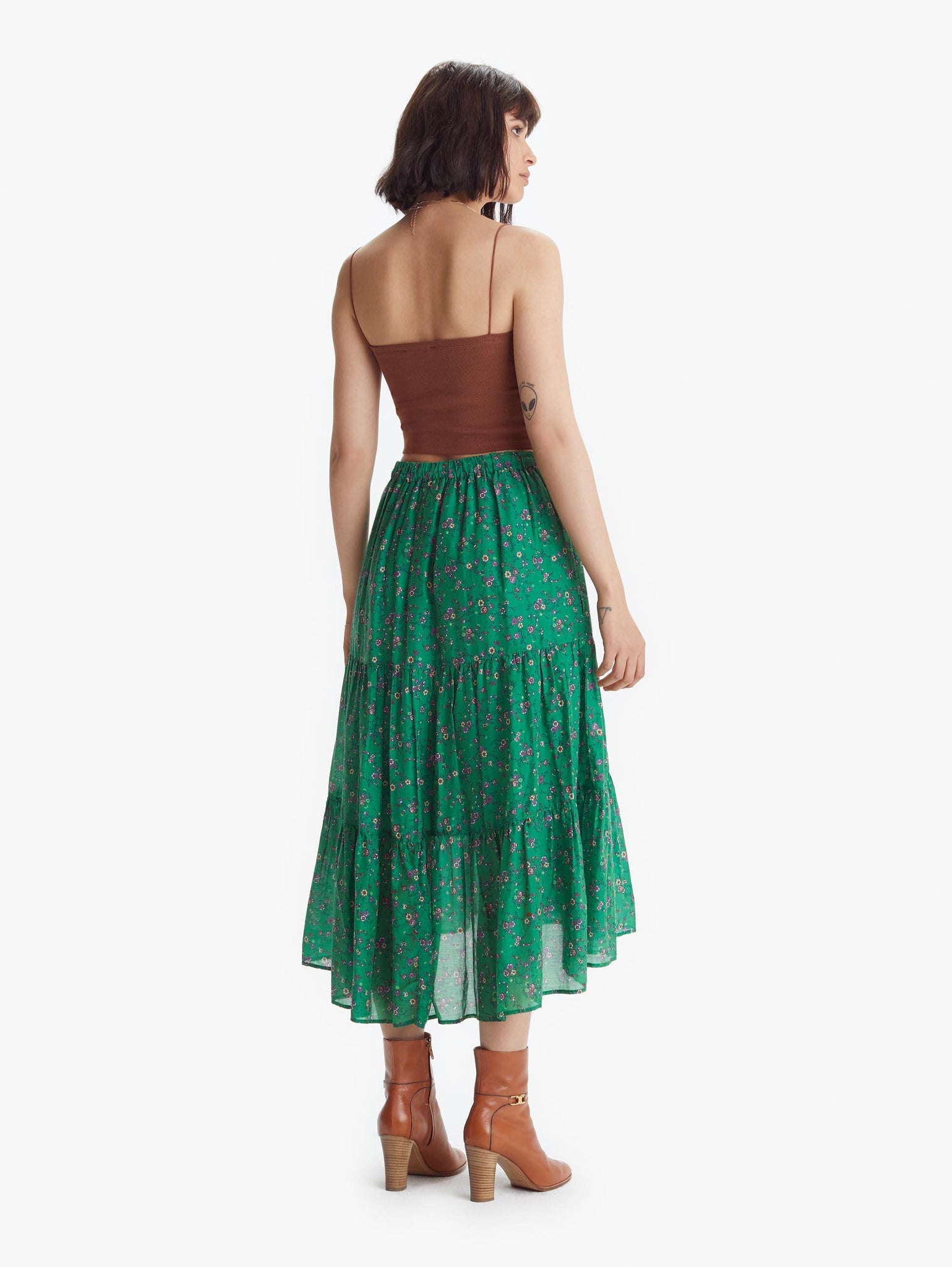 Fresh cut. Tiered midi-skirt in green grass.Cut longer in the back and side-slit pockets to hide your trinkets. Made in Los Angeles. Style No. T694-611-NOC, X03734.